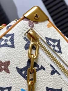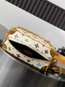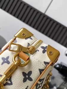 LV&Tyler co-branded MINI SOFT TRUNK bag reinterprets Louis Vuitton’s classic aesthetic. This structured box-shaped bag features sharp angles, metal-reinforced corners, and vividly embodies the heritage of trunk-making. The gold-tone chain attached to the zipper exudes contemporary flair. Monogram-printed calf leather Convertible crossbody/shoulder bag Unisex design