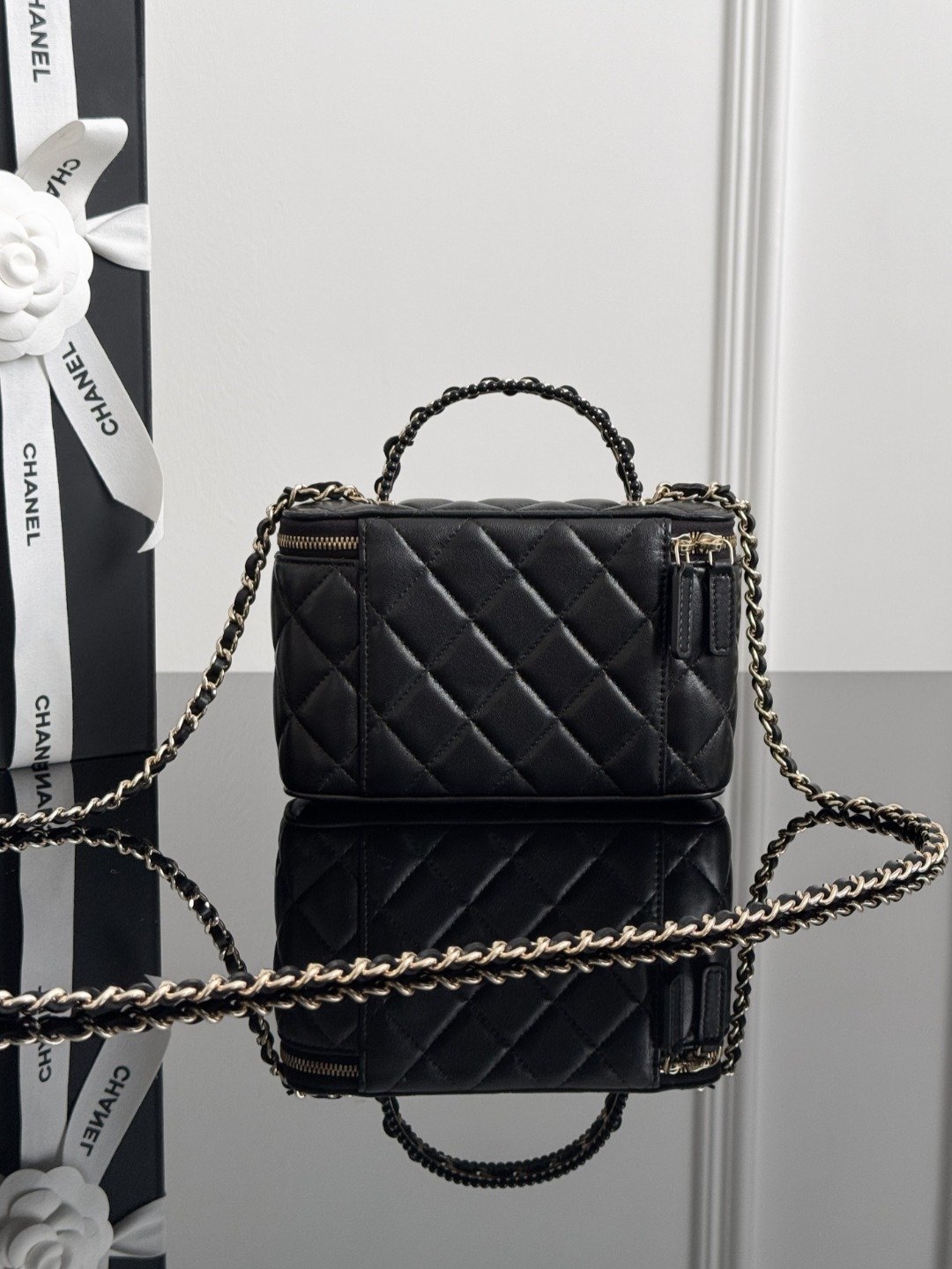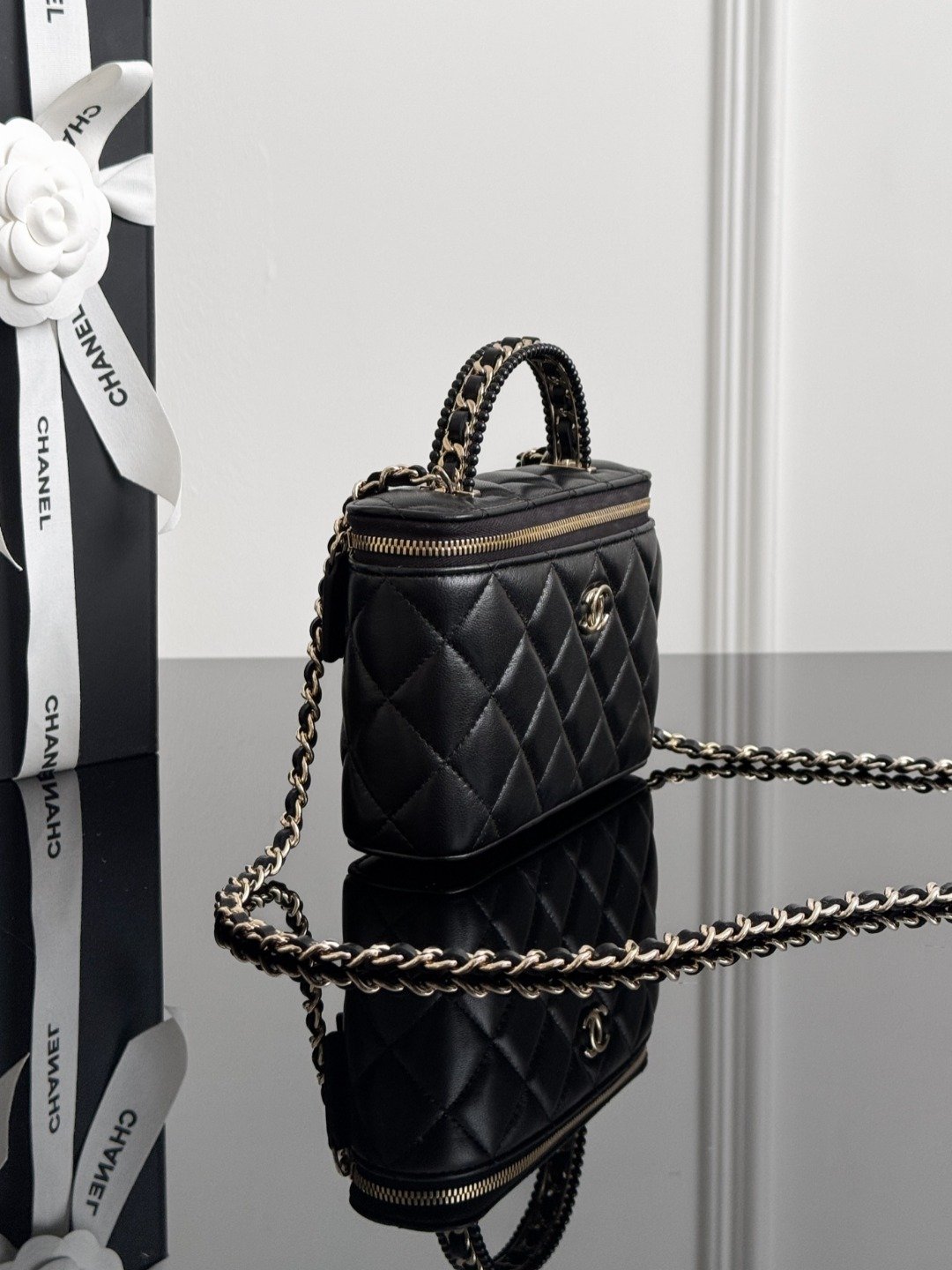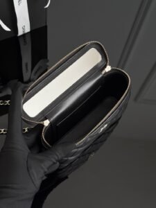 The 25p series offers a variety of box bags, each with unique highlights and thoughtful details. The small double-C logo and black-gold color scheme embody classic elements throughout the bag. The handle serves as the finishing touch, exuding understated sophistication in its exquisite craftsmanship. The actual product is stunningly beautiful.