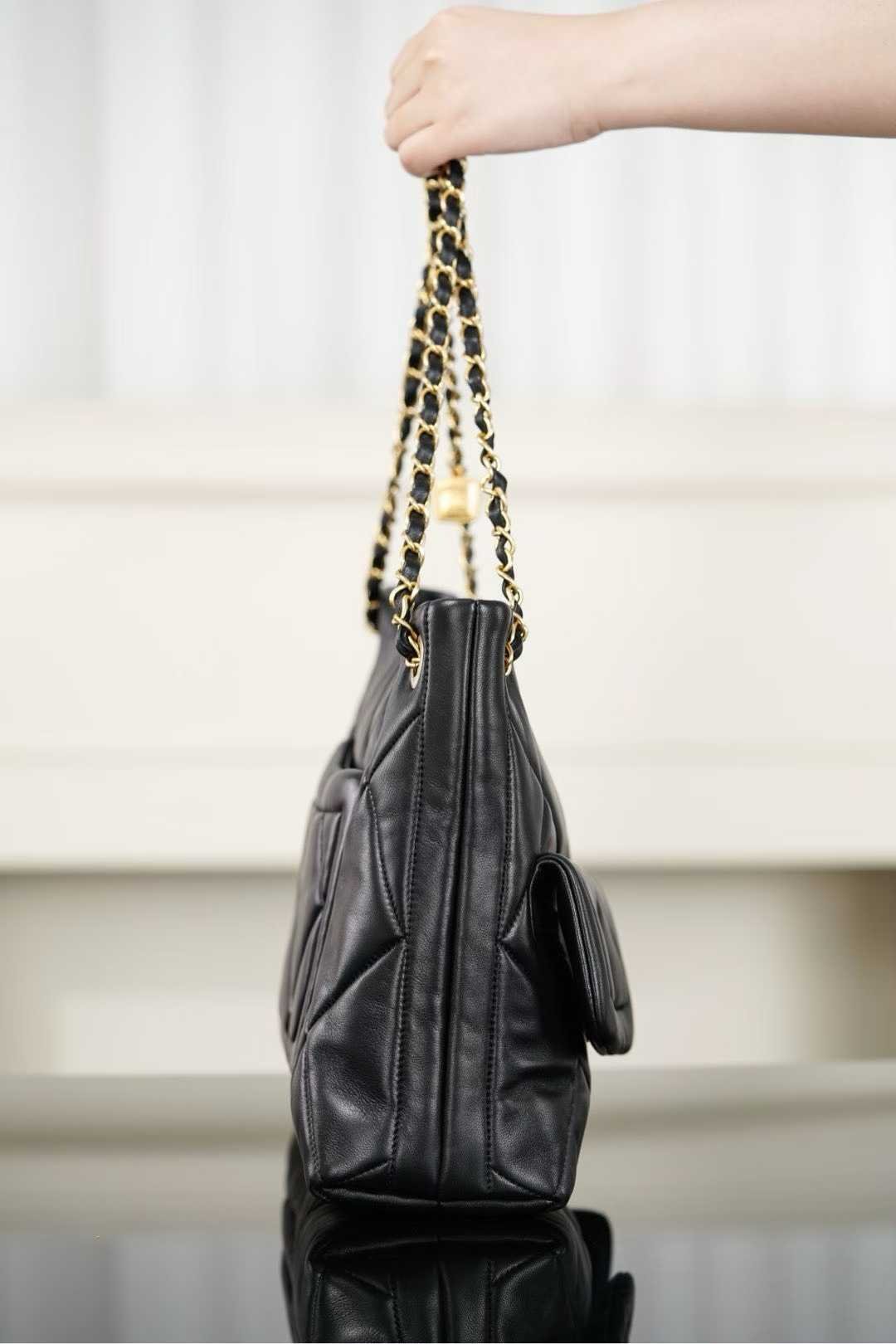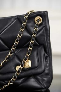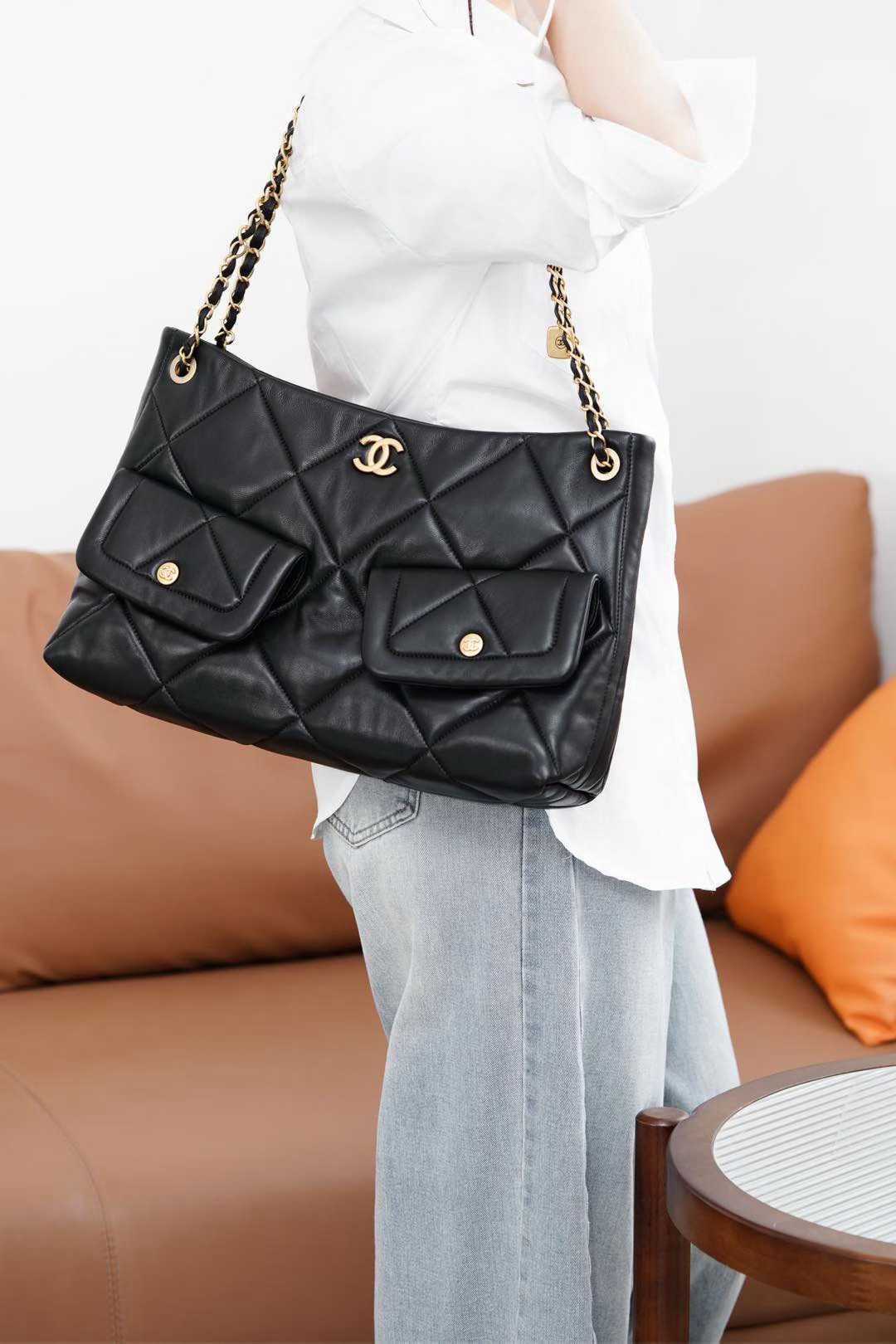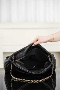A must-have chocolate-smooth black goatskin bag for autumn/winter with exquisite soft texture! The classic quilted pattern, dual C hardware, and small gold plaque on the chain are eye-catching. While full of retro charm, its hobo-style casualness perfectly balances “elegance” and “relaxation” with gentle harmony. The supple bag shape looks