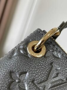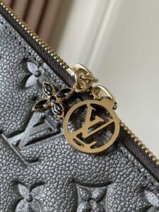 This Pochette Sèvres from the LV ski collection is ready to shine in a “glittering” gunmetal hue. Crafted from the iconic Monogram Empreinte leather with pale gold hardware for an elegant contrast, it features dual zipper pulls adorned with two pendants—one showcasing the LV circle and the other a crystal-embellished Monogram flower. Consider it the perfect après-ski bag.