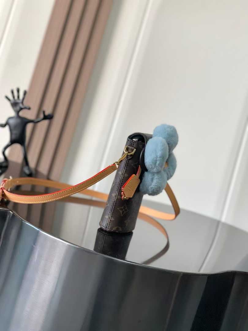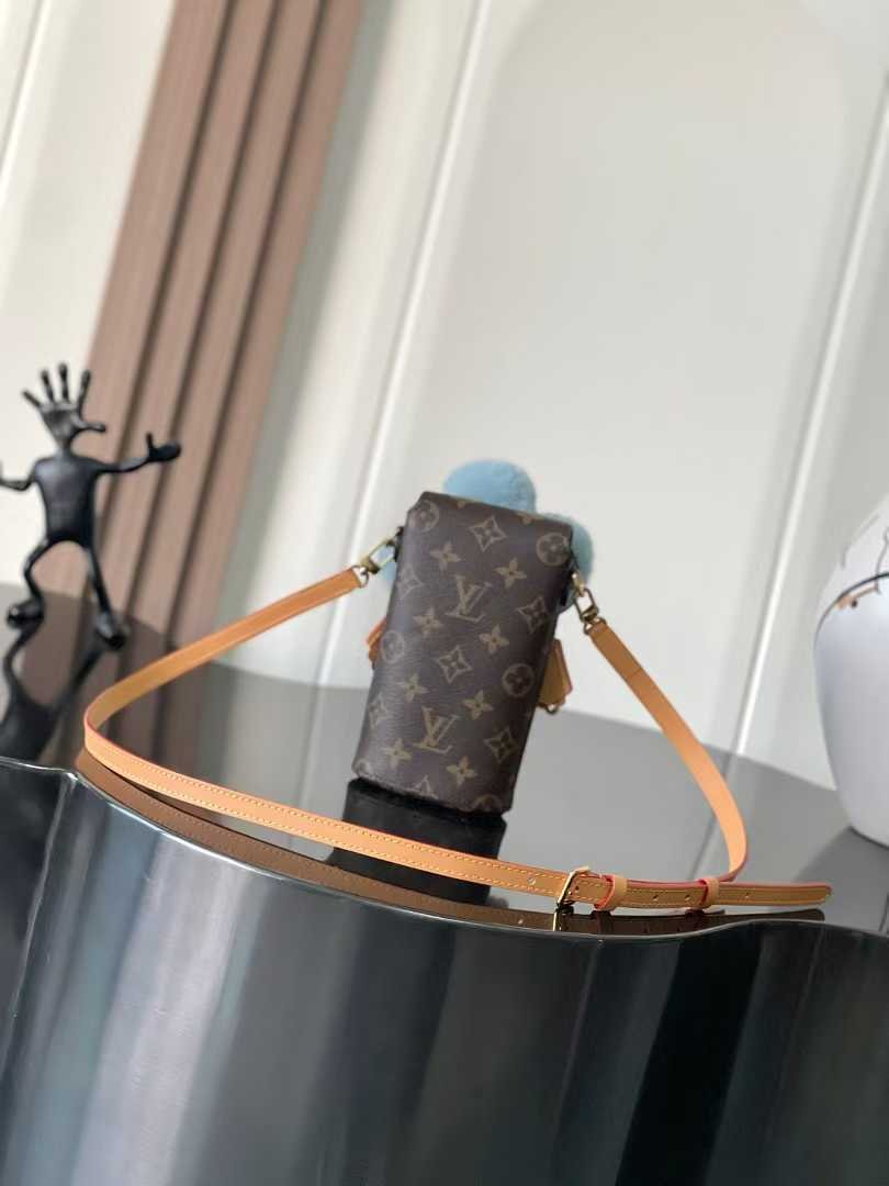 Vivienne phone bag from the Snow Show collection, crafted with iconic Monogram canvas and striking shearling trim for a coveted piece. Microfiber lining prevents phone scratches.