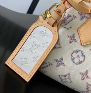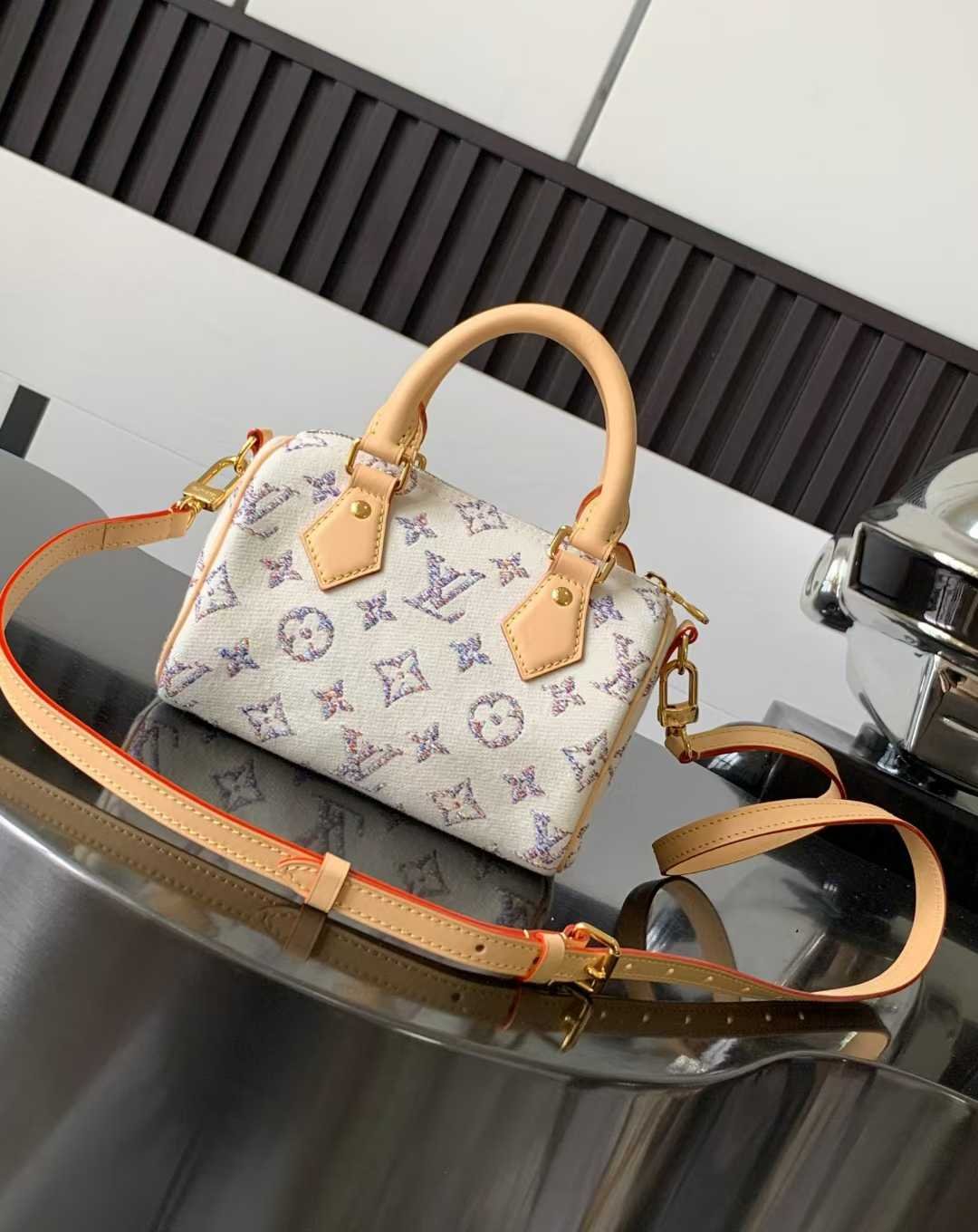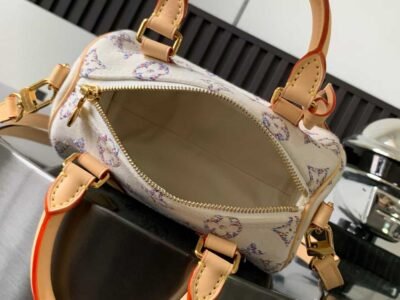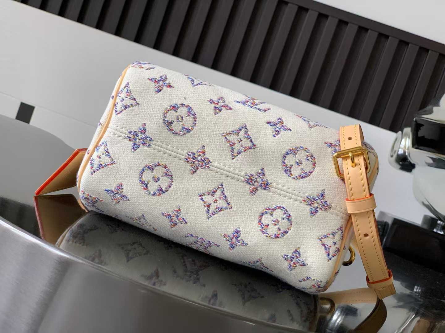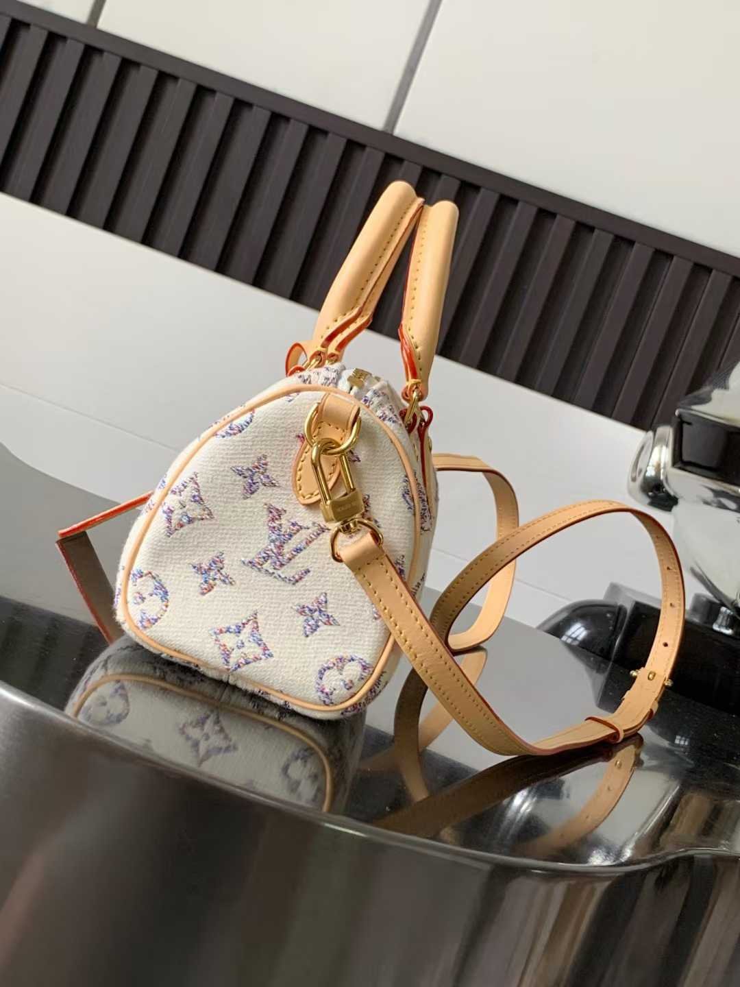 Speedy Bandouli è re 20 uses jacquard technology to depict LV letters and Monogram flowers with colorful yarns, presenting subtle color gradients. The fabric surface is coated with a protective layer, and the leather shoulder strap can be removed