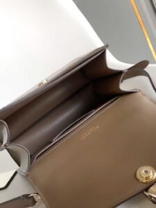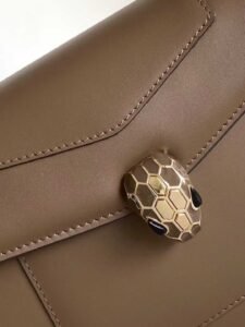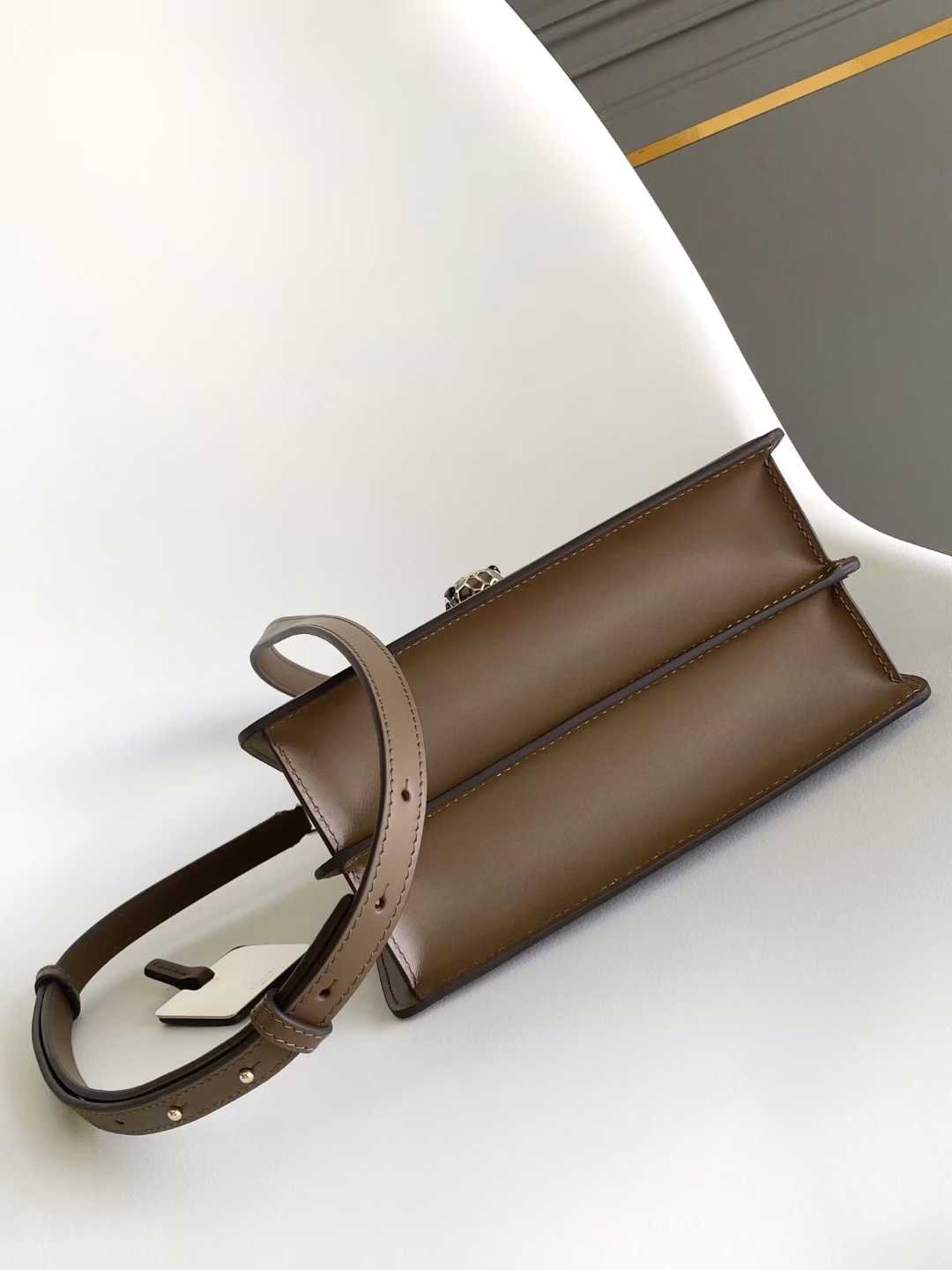 Crafted from exquisite Roman granite brown calfskin, it masterfully blends classic design with modern style, vividly showcasing the endless charm of the collection. This effortlessly wearable handbag introduces fresh details into its iconic elements, paired with a leather shoulder strap adorned with the signature snake-head magnetic clasp. Its mesmerizing scales and design draw inspiration from the 1960s SERPENTI jewelry collection. Featuring one compartment, a front pocket, a rear exterior patch pocket, an internal open pocket, and an internal mirror compartment with a customizable makeup mirror.