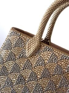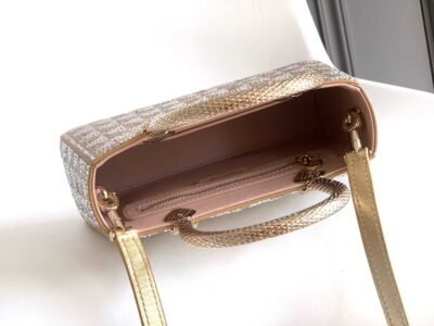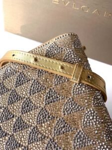 The jewelry elements, exquisite craftsmanship, and Roman inspiration are seamlessly blended, evoking the graceful and agile posture of a serpent, showcasing refined charm. This handbag is meticulously crafted from soft and durable beige calfskin, adorned with a dazzling “Calla” pattern formed by hand-set silver and translucent beige crystals, drawing inspiration from the DIVAS’ DREAM jewelry collection—the Baths of Caracalla. The piece features two scaly serpent-shaped handles, inspired by a bold and unconventional SERPENTI watch released by BVLGARI in the 1960s. It comes with a leather shoulder strap, an open single compartment, an internal flat pocket, and a zippered pocket.