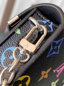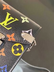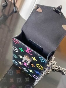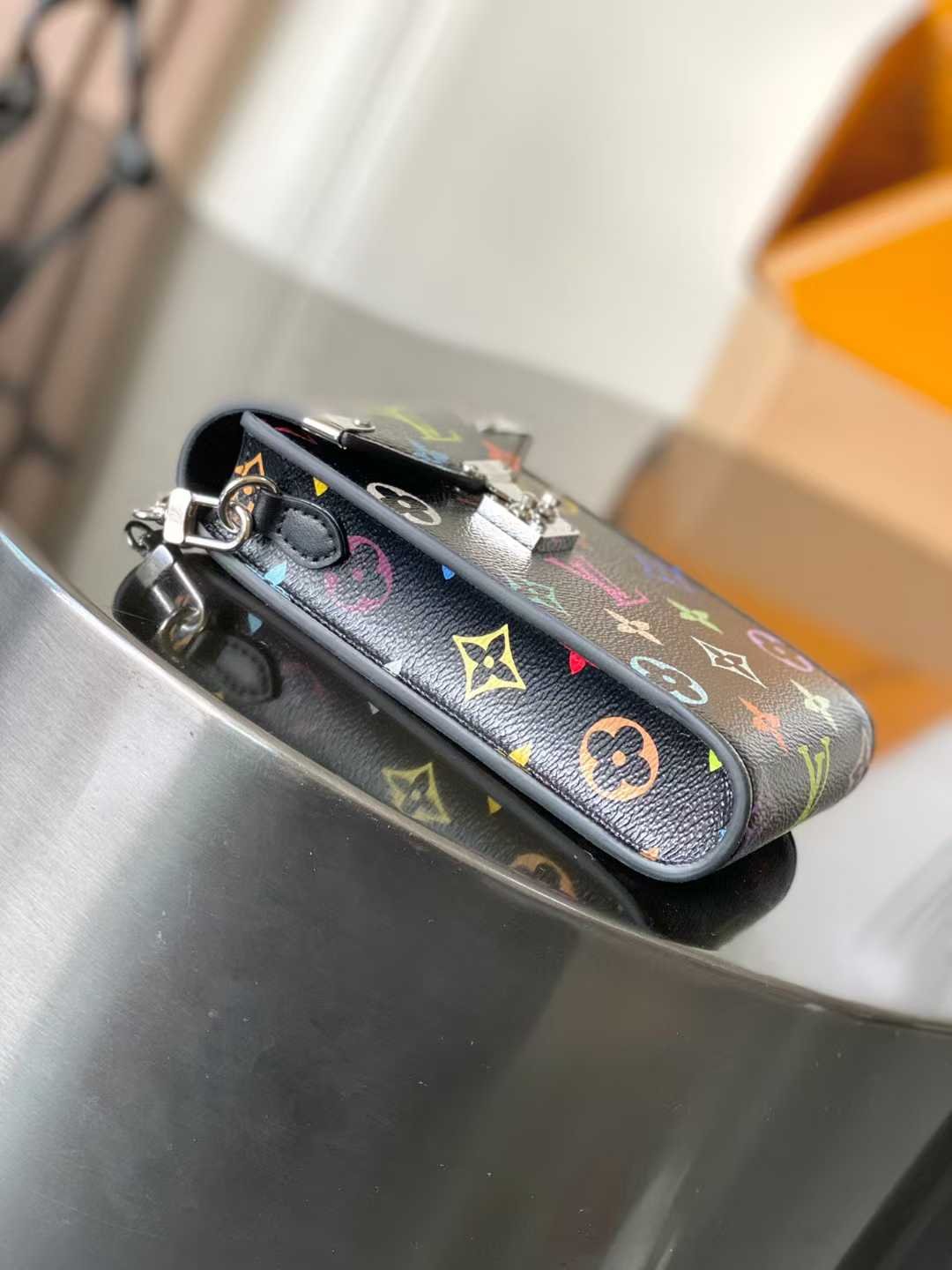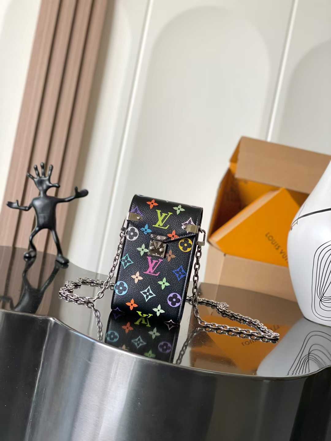 This Metis phone bag is from the Louis Vuitton × Takashi Murakami re-edition collection, showcasing a lively personality with its colorful Monogram coated canvas. The flap features studded corners and an S-lock clasp, paying homage to the brand’s traditional trunk design while easily accommodating phones and keys. The detachable chain allows for versatile carrying options.