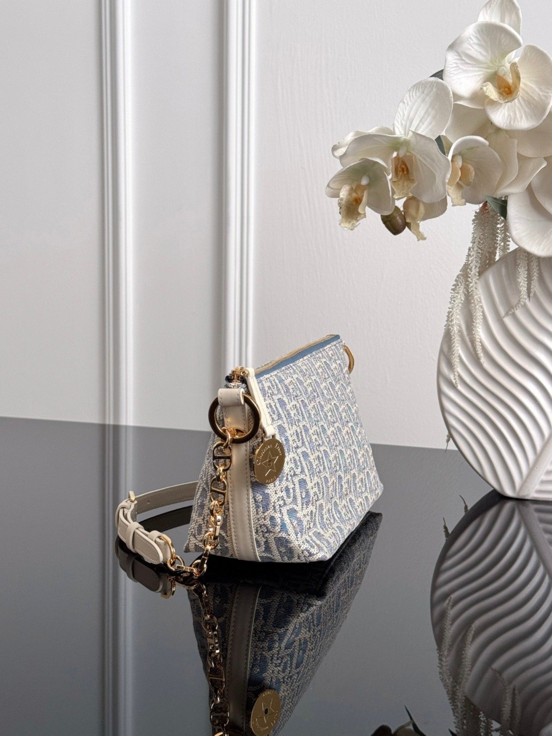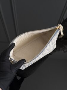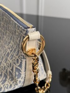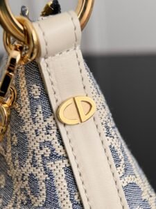Diorstar Hobo star logo straw checkered lunch bag Sky blue fabric paired with creamy white calfskin, the light color palette appears fresh and soothing. The effortlessly chic hobo bag is both fashionable and elegant.