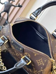 The Speedy Trunk handbag reconstructs classic design with bold ideas and makes a remarkable appearance at the Louis Vuitton 2025 Cruise early spring show. Monogram canvas paired with Monogram Reverse trim showcases Nicolas Ghesquiere’s iconic brushstrokes, while dazzling metal pieces pay tribute to the brand’s long-standing box making heritage. The shoulder strap and chain can be removed, suitable for crossbody, shoulder back, or handheld use.