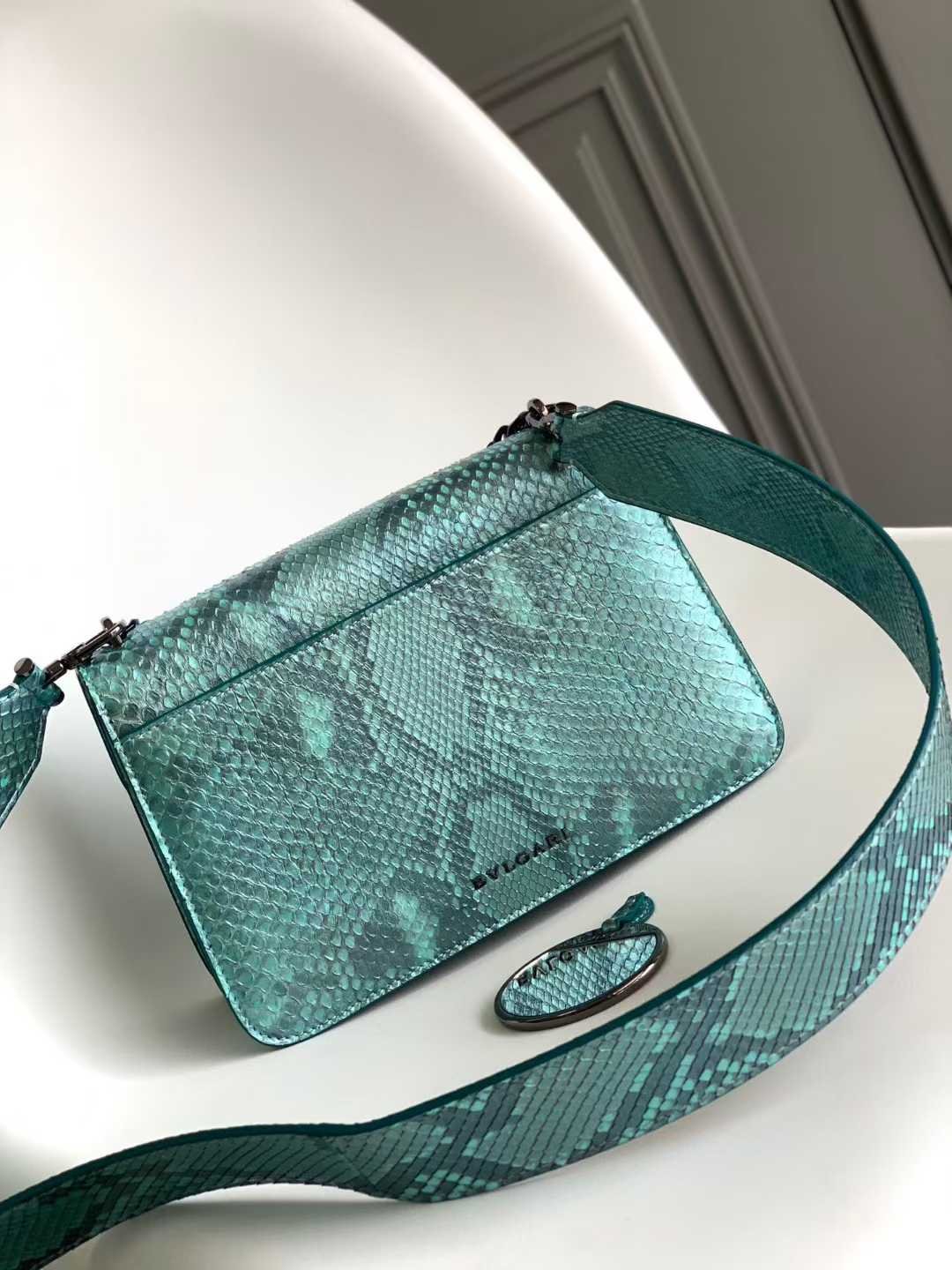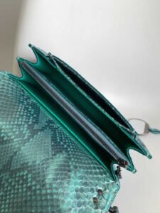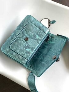 This MaxiChain bag is crafted from precious aquamarine light blue “Afterglow” pearlescent python leather, featuring a dark ruthenium-plated brass Serpenti snakehead clasp. The center is adorned with small gray mother-of-pearl snake scales, accentuated by red enamel eyes, blending novelty and classic elegance. The BVLGARI teal topaz green chain, reminiscent of a necklace, embellishes the flap and also serves as an exquisite handle, showcasing the design essence of the jewelry brand BVLGARI. Medium in size, it includes two storage compartments, with an exterior front pocket and a back patch pocket. The interior features an open pocket, a divided zippered pocket, and a customizable makeup mirror. It comes with an adjustable, detachable leather strap and an upgraded golden gift box.