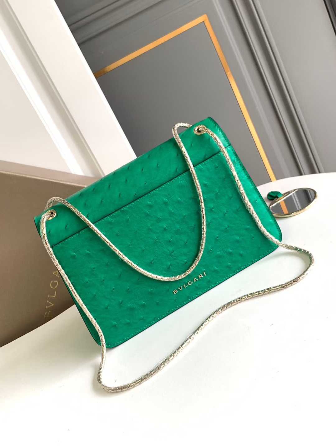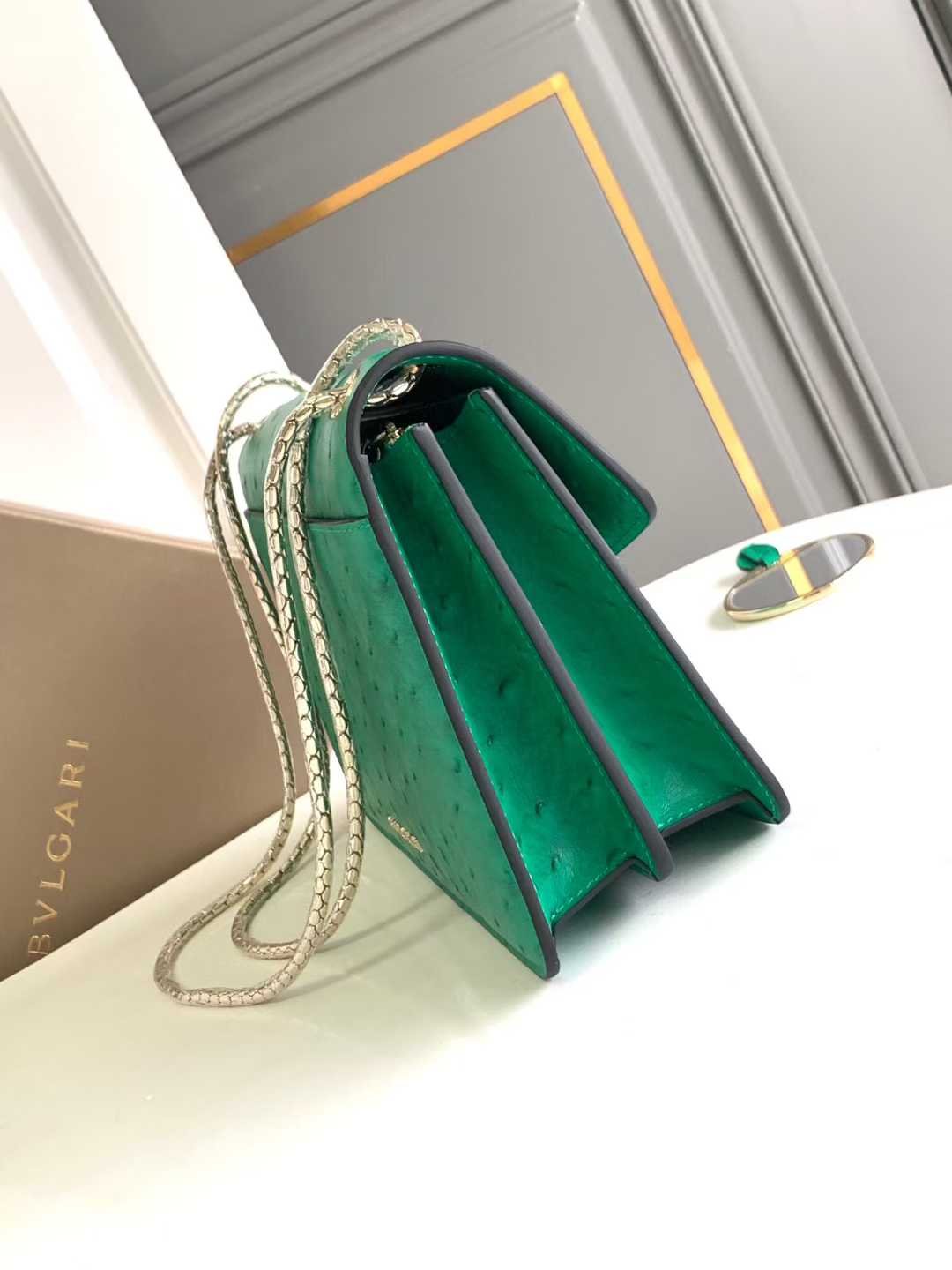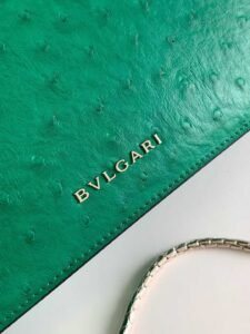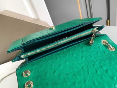 Crafted from emerald green ostrich-patterned calfskin Skillfully blending modern style with versatile charm The piece features a serpentine chain strap adorned with the iconic snake-head magnetic clasp Its mesmerizing scaled snake head draws inspiration from the 1960s SERPENTI jewelry collection Equipped with two compartments, a front pocket, a back patch pocket, an interior zippered and open pocket, a customizable makeup mirror, and the BVLGARI metal logo on the back