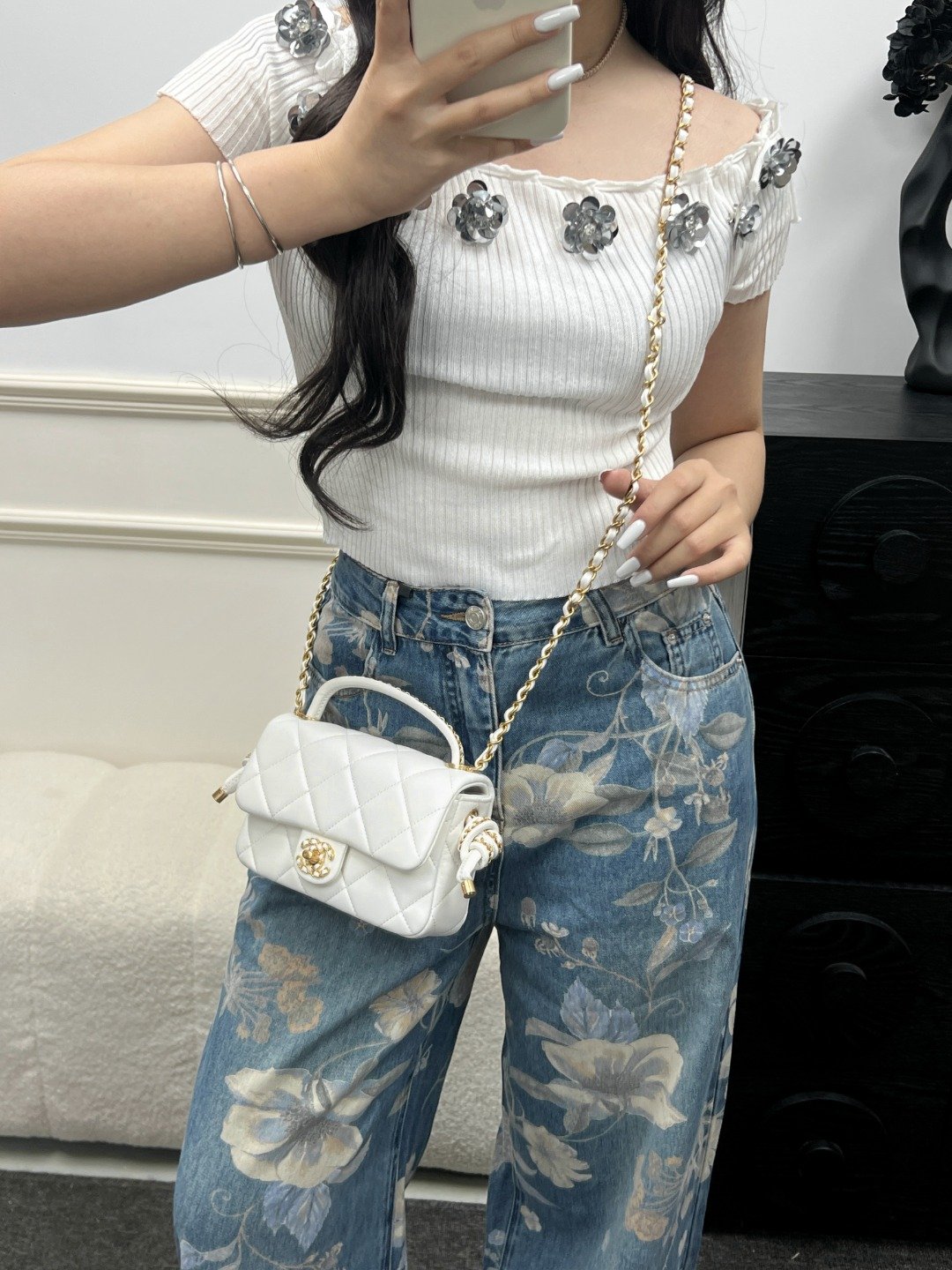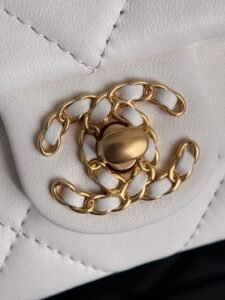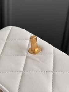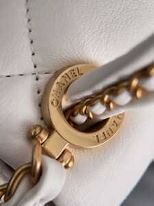 25c drawstring flap bag in white – antique gold buckle Woven knot handle bag with lambskin and exquisite metal handle braided design, classic chain style, simple yet sophisticated silhouette, elegant gold ring accent