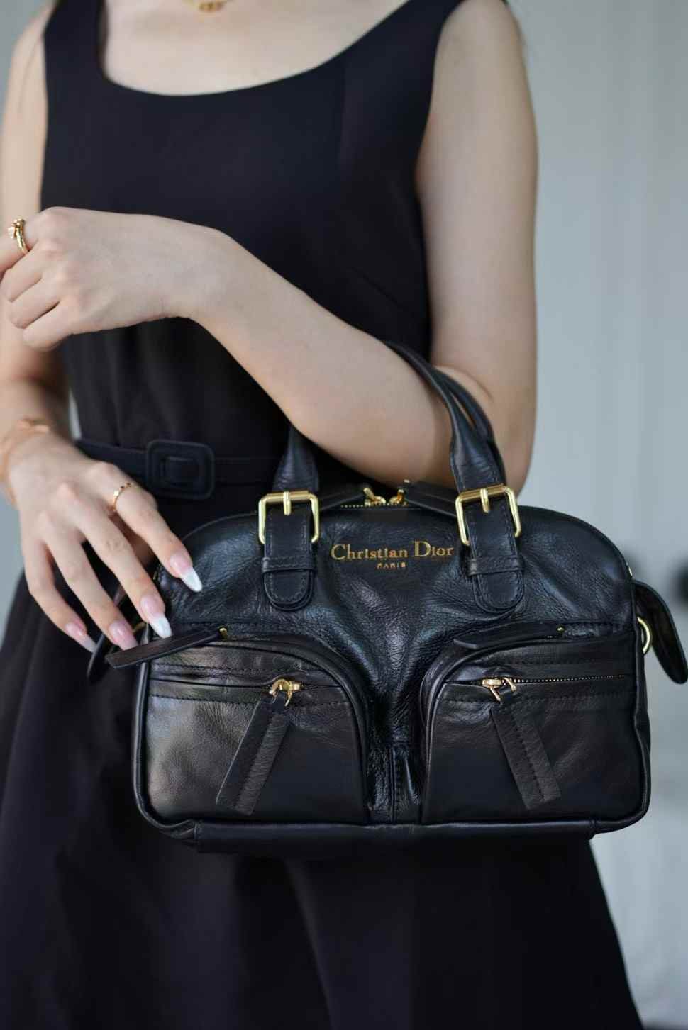 Bowling bag in small size 28cm made of oil-waxed calfskin Crafted with artfully retro crumpled oil-waxed leather, this spacious and soft multi-compartment handbag Exudes vintage charm at first glance, creating a retro-modern appeal Incorporating this year’s trendy multi-pocket functional elements – super stylish!
