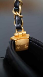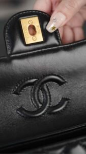 The texture of lambskin, black and gold color scheme, diamond quilting design, retro and stylish, the appearance is somewhat similar to Kelly, with a more square silhouette. Like Kelly, it has four studs at the bottom. The size is moderate, fitting a 16 Pro Max, lipstick, car keys, etc. It’s a very practical and fashionable item.