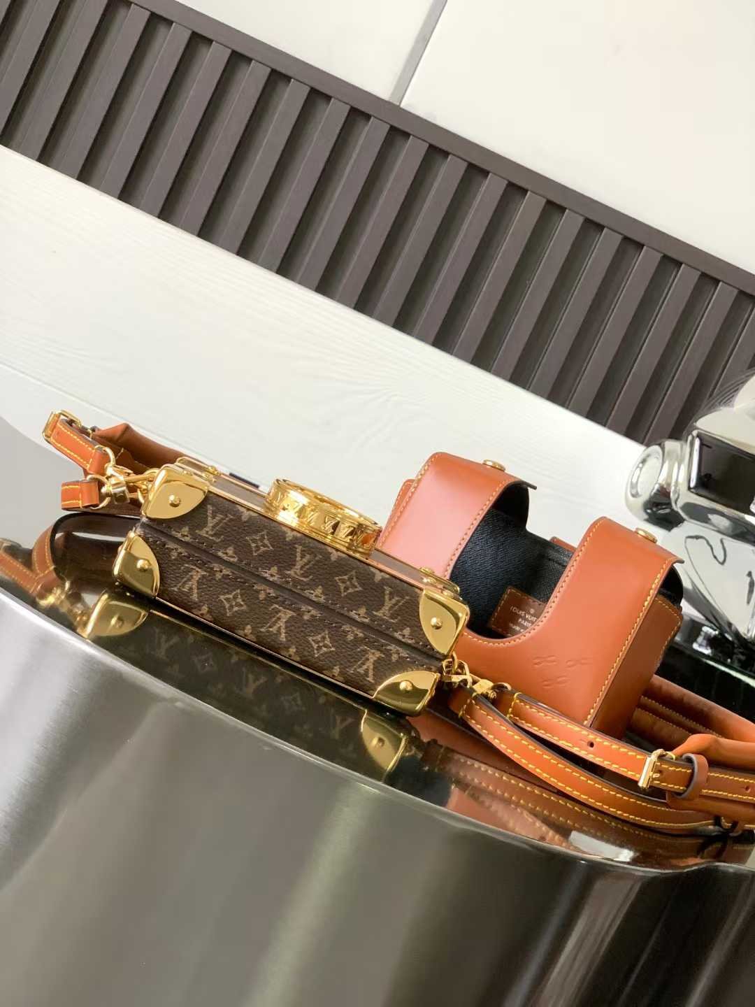 This Pic Trunk is an extraordinary masterpiece from the 2024 spring-summer fashion show, ingeniously designed as a miniature vintage camera. The compact hard case is crafted from Monogram canvas, overlaid with cognac-colored calfskin, and adorned with a golden LV Circle logo “lens cap.” This eye-catching accessory comes with a padded shoulder strap, allowing for neck-wearing, shoulder-carrying, or cross-body styling with a short strap.