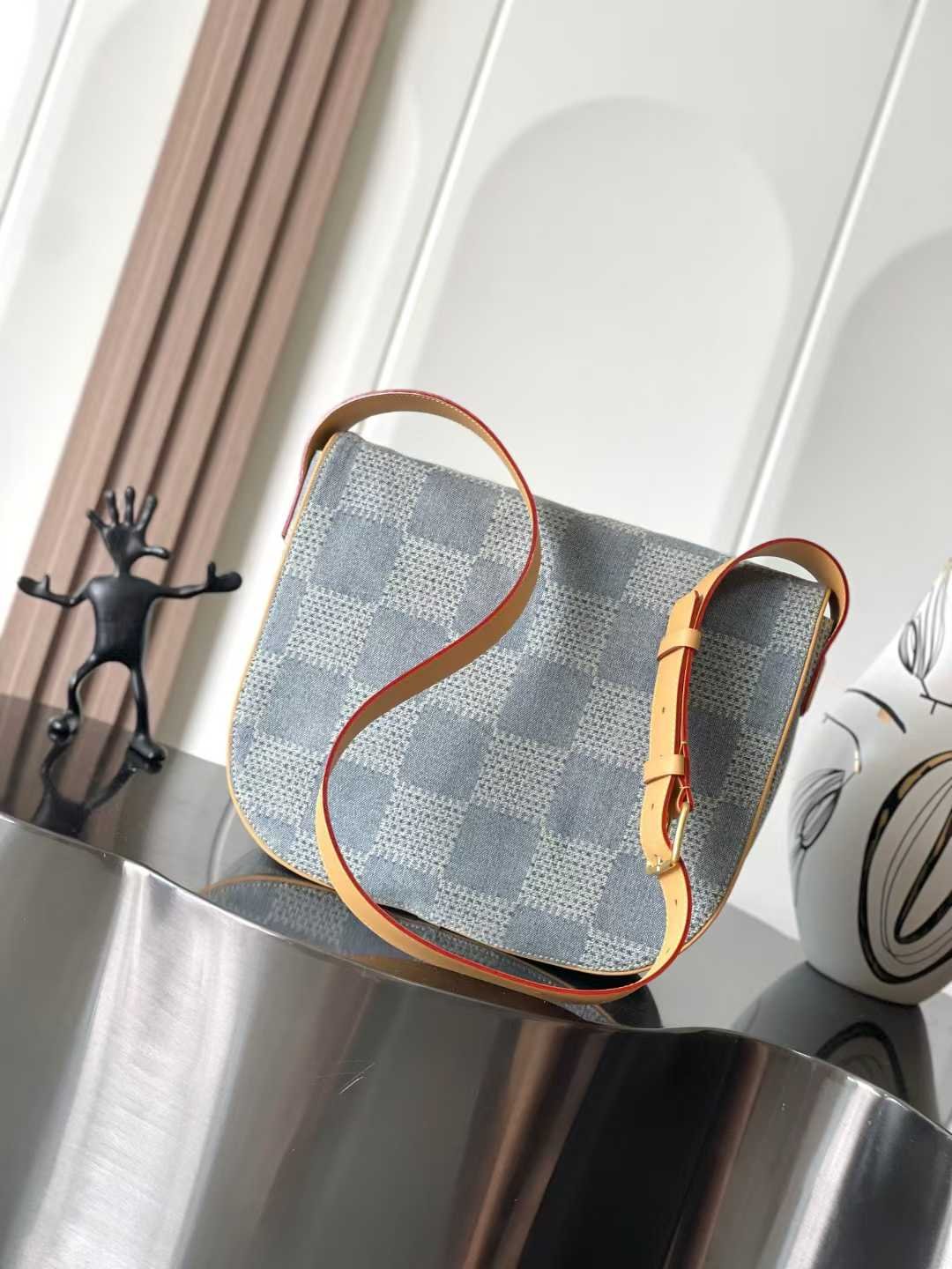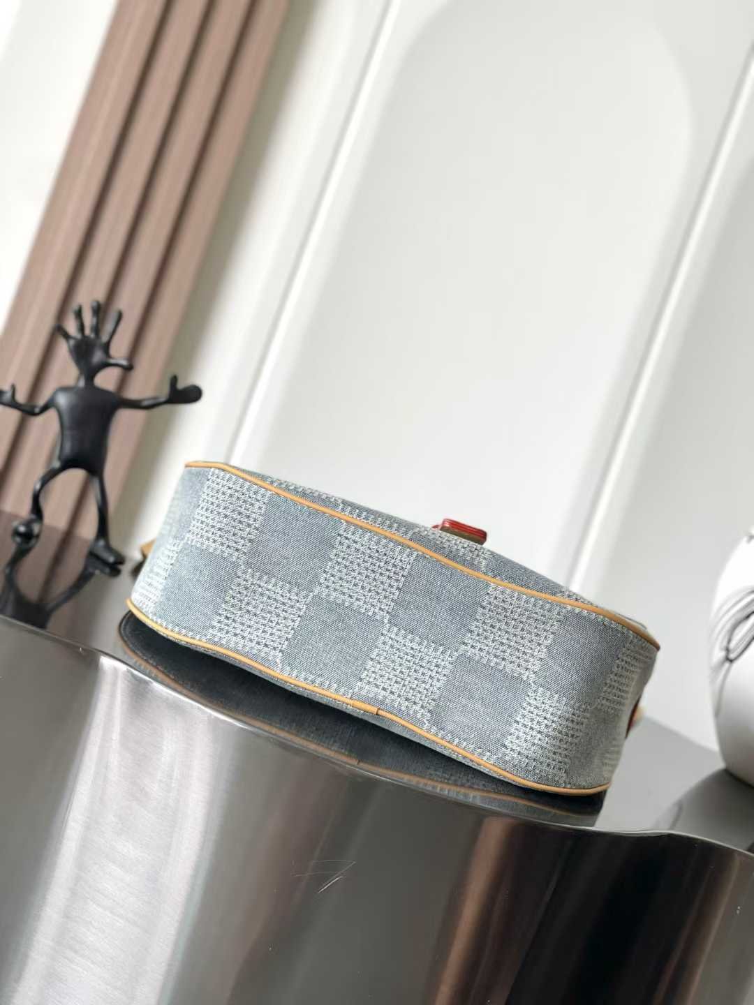 Using Damier Denim 3D cotton canvas to create a rounded silhouette, the unique checkered texture presents a soft texture. Montsouris buckle and shoulder strap highlight classic details.