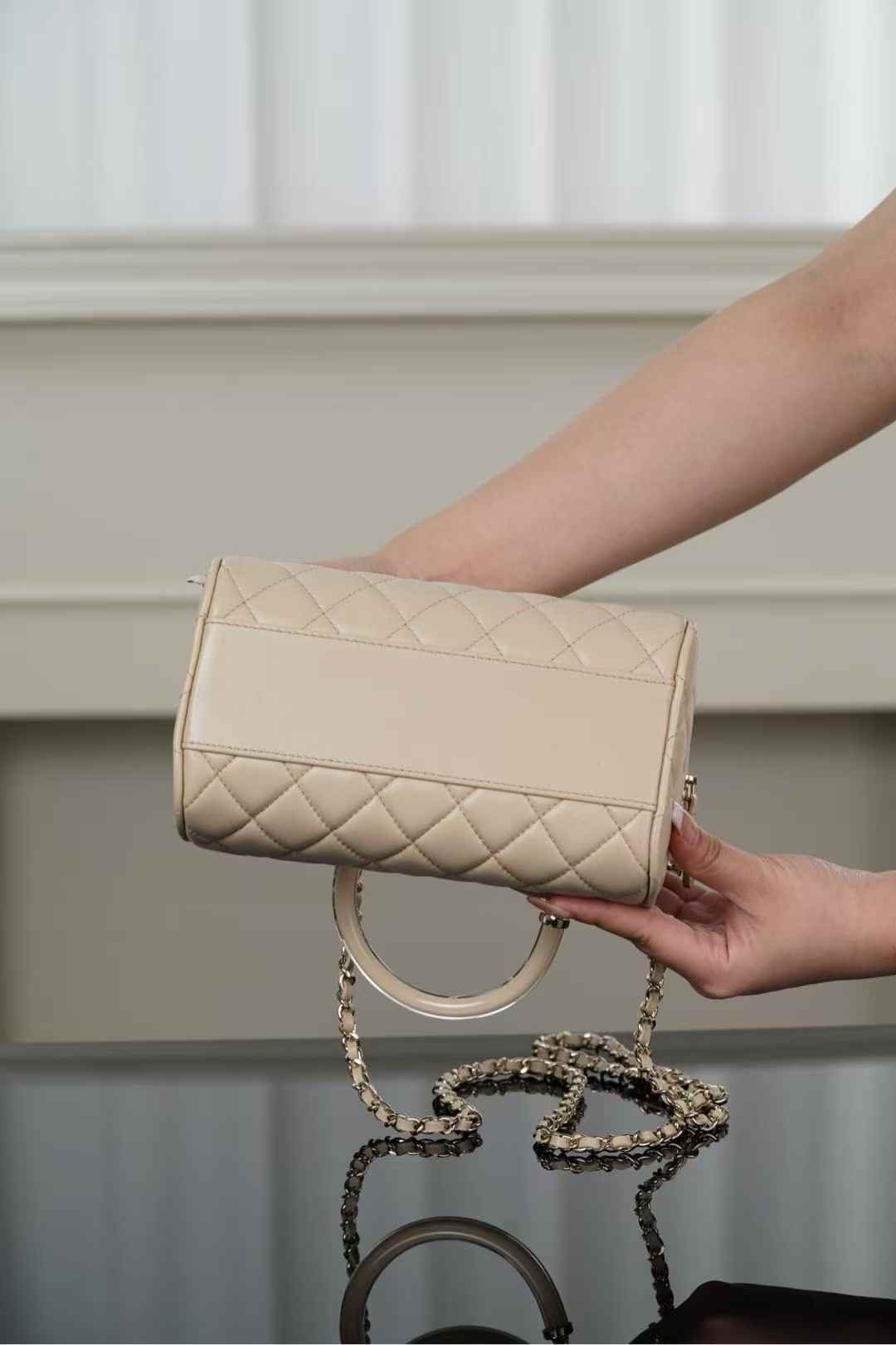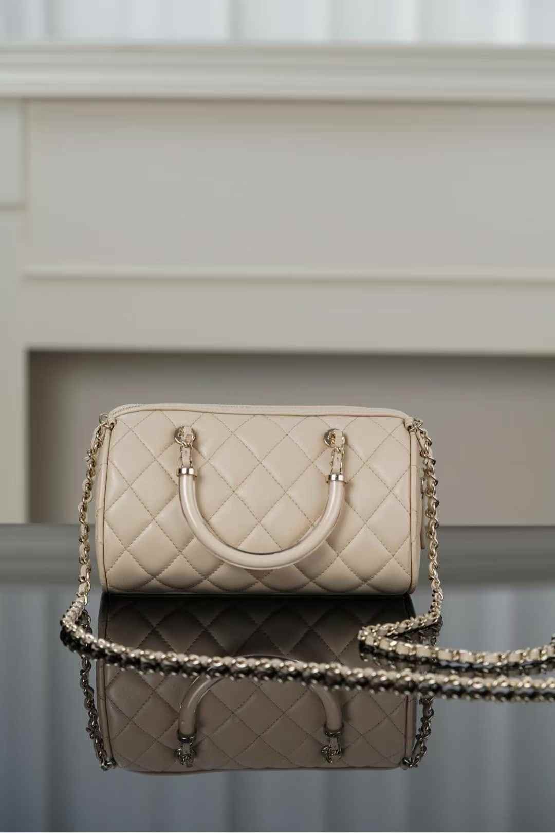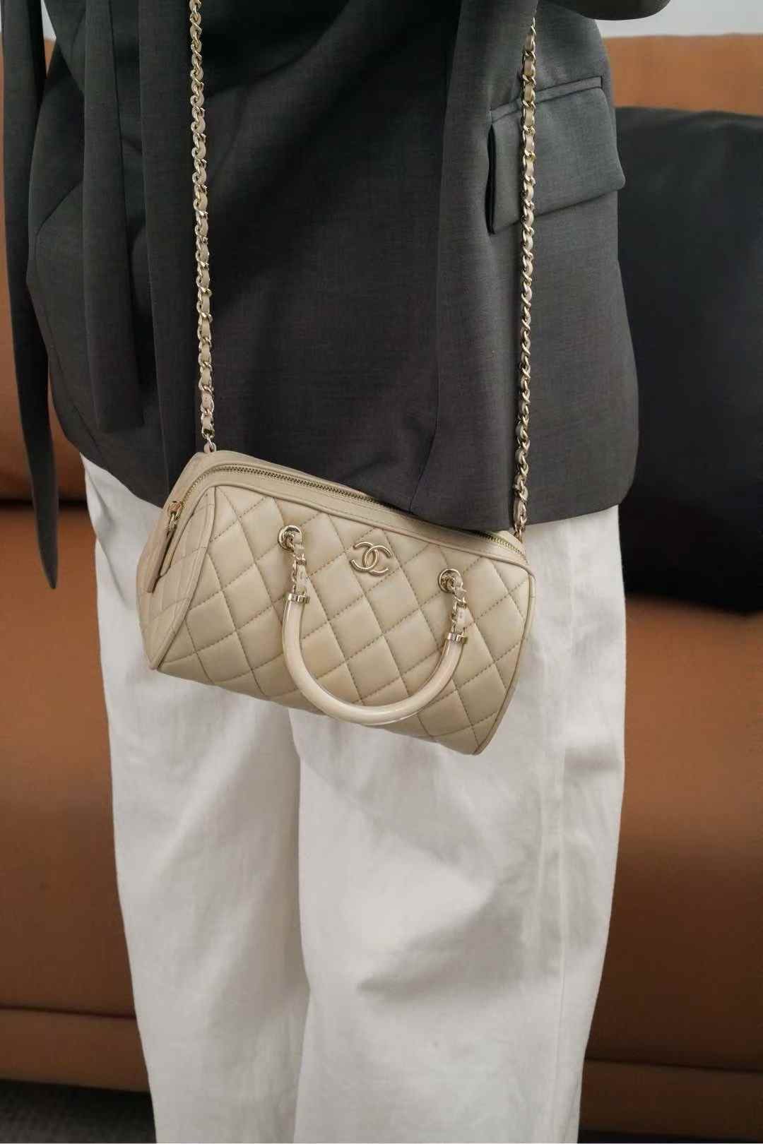 Chanel 25c early spring Boston bowling bag in beige 11×18.5×11.4cm