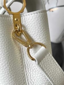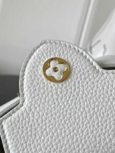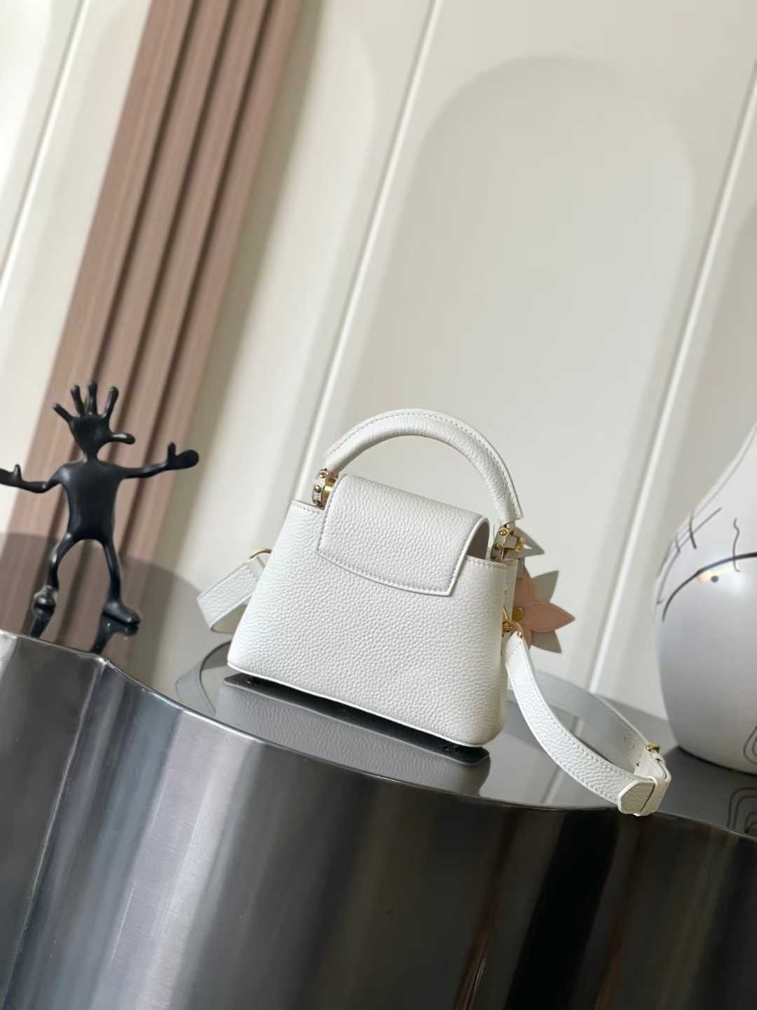 his mini Capucines bag is crafted from soft Taurillon calfskin, adorned with detachable Monogram floral-shaped leather accents for a seasonal refresh. The versatile design features a top handle and an adjustable, detachable strap, allowing effortless transitions between hand-carry, elbow-carry, shoulder-carry, and cross-body styles.