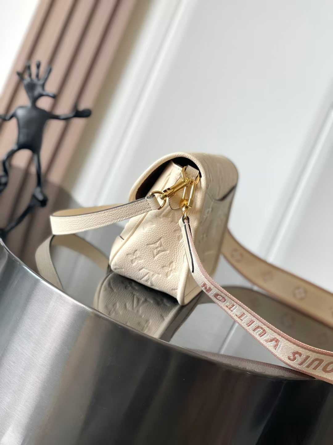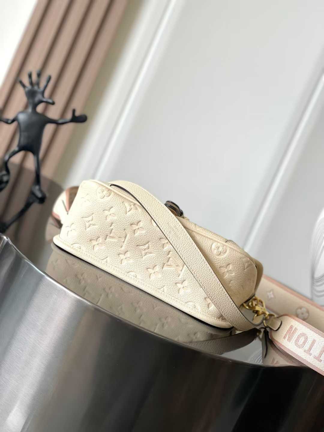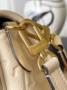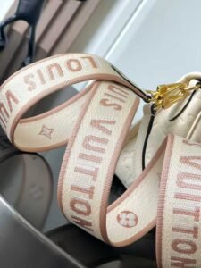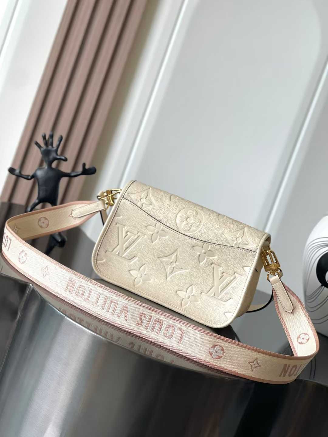 This Diane bag is crafted from Louis Vuitton’s iconic Monogram Empreinte embossed leather, featuring the brand’s signature woven into a detachable wide jacquard shoulder strap, offering an additional cross-body option alongside the detachable leather shoulder strap for versatile elegance or dynamic style.